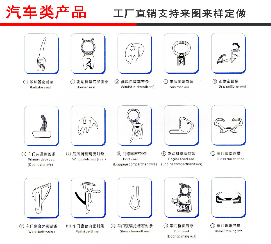 2. 汽車密封條應用在車門、車窗、前后檔風玻璃、天窗,發(fā)動機蓋和行李箱蓋上,起到防水、防塵、隔音、隔熱、減震、裝飾的作用。